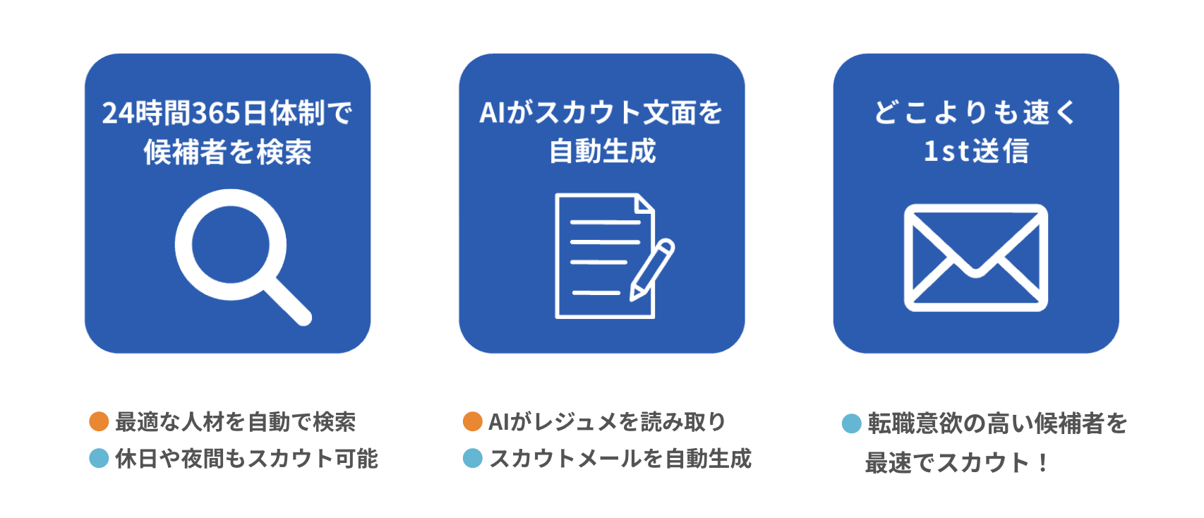 - 採用ポジションに最適な人材を24時間365日体制で自動検索。休日や夜間のスカウト送信も可能です。
